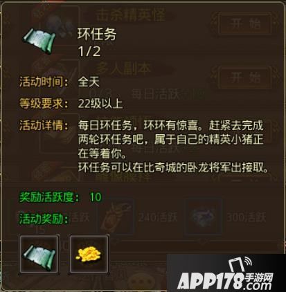 环任务是在比奇城NPC卧龙将军处领取,可以通过【今日目标】接取任务。每天可以做2次环任务,完成后活跃度+10,之前一天做一半的话,完成时会影响当日的次数。