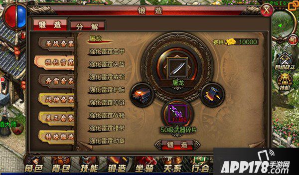 在《沙巴克传奇》中玩家职业装备获取途径主要有两种一种是靠怪物掉落,一种则是玩家可以自食其力通过游戏主界面进行锻造,而且锻造出来的装备还会是套装装备喔,既然是锻造自然也就少不了材料,对应部件的装备锻造需要对应的碎片材料,比如武器碎片、防具碎片及首饰碎片,只要碎片足够15-50级的装备都是可以直接锻造的,只是等级越高的装备需要的碎片则要越多。