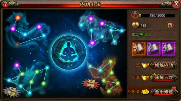 《沙巴克传奇》内功心法主要分青龙、朱雀、白虎和玄武4大神兽相性供玩家进行修炼,不同的心法修炼会有不同的角色增益,玩家可以根据自身角色职业的定位来选择最合适的心法搭配。