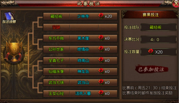 对于不能参与封魔榜PK赛的玩家除了可以给行会兄弟加油助威之外,也可以通过游戏主界面比赛投注图标或者在封魔谷NPC-封魔战神处也可以进行投注,活动结束时,会根据玩家的押注情况给予邮件发奖,只要竞猜成功就有机会获得大量金币奖励,快速发家致富。