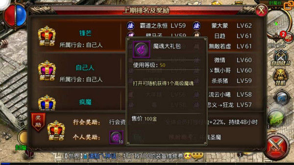 根据封魔榜挑战赛玩家所在战队的表现,系统服务器将会发放不同等级的活动奖励,获奖队伍所在的行会不仅可以获得大量行会资金之外,还有特殊经验BUFF,而作为参赛队伍的队员玩家还可以获得魔魂大礼包,因此封魔榜挑战将会是证明玩家行会实力最重要的标准之一。
