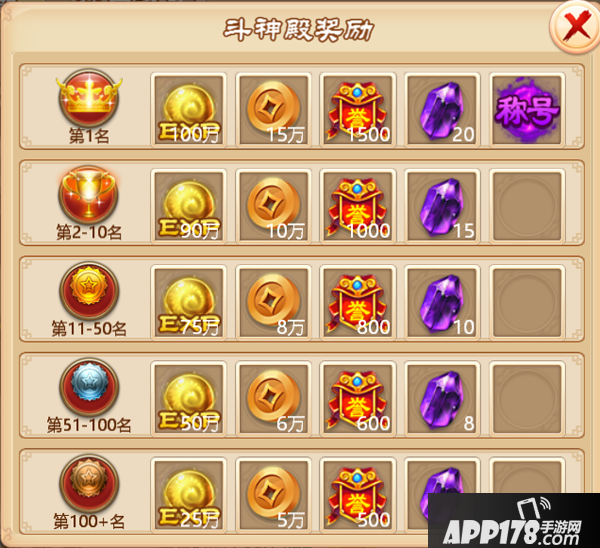 2、排行奖励:玩家挑战斗神殿,获得一定排名靠前,即可获得排名奖励。系统根据每天0点时玩家的排名发放奖励,玩家点击【排行奖励】中看到自己的排名以及领取奖励。