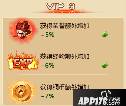 VIP3:获得荣誉额外增加+5%,获得经验额外增加+6%,获得铜币额外增加+7%