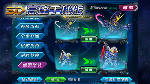 巧妇难为无米之炊,为心爱的高达涂装也需要收集相应的材料,那么材料如何获得呢?那就来《SD高达手机版》的世界大战中试一试吧!在这,你将与众多能力相 当的机师比拼实力,展现自己强大的操作技术。若能获得本次战斗的冠军,不仅能受到大家的膜拜,还能获得海量涂装材料。既能获得荣誉,又能获得丰厚奖励,用 实力证明自己吧!