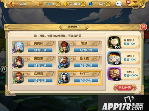 英雄升级可以点击英雄,然后选择需要升级的英雄,点击左下角的提升等级,选择需要使用的升级道具(包子),可以点击自动升级,或者点击不同的包子。