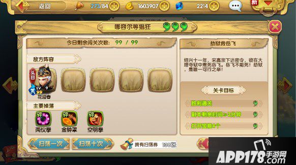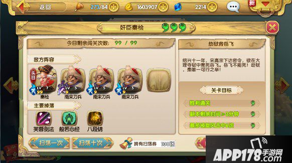 如图在“奸臣秦侩”这一关,玩家必须完成关卡时副本剩余时间≥2分钟,并且最多被关卡内的旋风击中6次,才能获得三星评价。