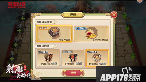 首先来介绍下押运的镖种类,《射雕英雄传3D》手游镖行九州玩法中的镖车类型有两种,分别是运送军饷与运送粮草,区别在于运镖结束后所获得的奖励,金币与经验,各位侠士可因时制宜,根据所需奖励选择镖车类型。