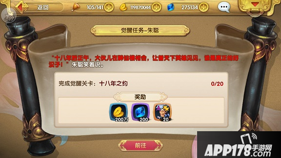 任务的第一步是一个觉醒关卡,达成目标是完成20次通关,大家不必担心20次太耗时长。完成第一次三星后,剩下的只需要扫荡即可。但需要提醒的是,本副本消耗的体力较大,每次要消耗24点体力,所以在做觉醒任务之前,需要留足体力。