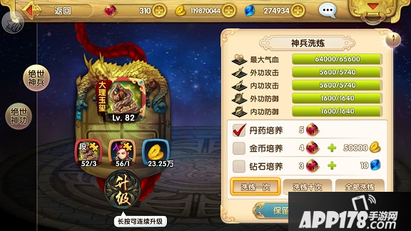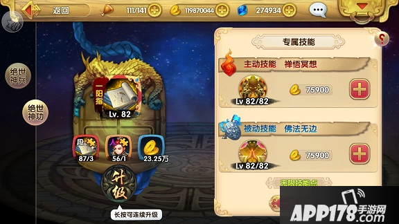神功的培养就较为简单了。和英雄技能的升级一样。对新增的两个技能用金币提升即可。同样是神功提升到多少级,技能就可以提升到多少级。