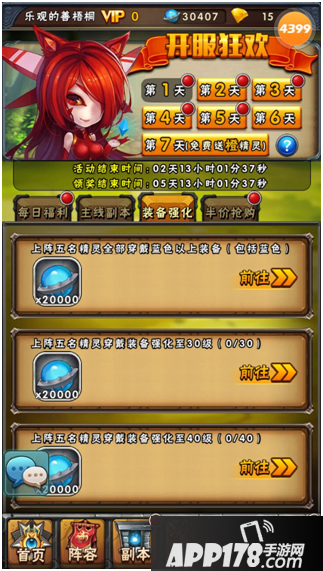 装备强化:上阵5只精灵全部穿戴蓝色以上装备(把有蓝色装备碎片的图刷光光~),全部装备强化至60级