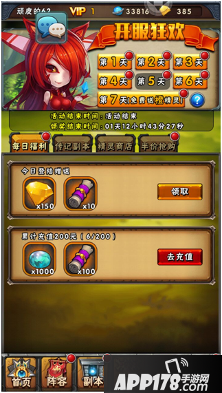 每日福利:登陆奖励(150钻+10个刷新卷轴),累计充值200元(1000个精魂+100个刷新卷轴)