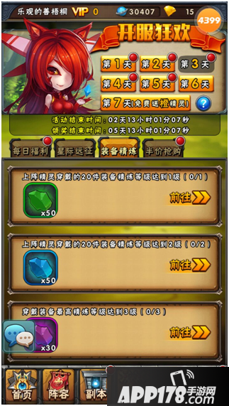 装备精炼:SO EASY~先随便拿件绿装穿戴上,然后精炼到10级,领完奖励,就把绿色装备拿去回收分解。然后将上阵的5只精灵所有装备都精炼到4级以上就可以领取完所有精炼石奖励