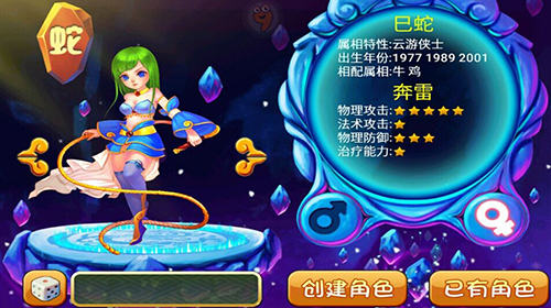 《十二生肖》的特色在于拥有男女各十二个的生肖角色,不同的属相有不同的形象,选择性多,算是12生肖的拟人化。虽然形象多样化,但也让玩家失去了自行捏脸搭配的机会。每个形象所对应的职业依然是常规的四种类型:有奶不怕负责治疗的青虚,皮糙肉厚抗打的玄卫,法攻的炎凰,物攻的奔雷。虽然小编很中意拿着长鞭的蛇姑娘,百般纠结下还是选择了马姑娘,虽然马姑娘在人设上看起来不怎么样,在游戏里倒还是蛮萌萌哒的。
