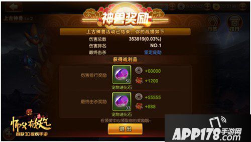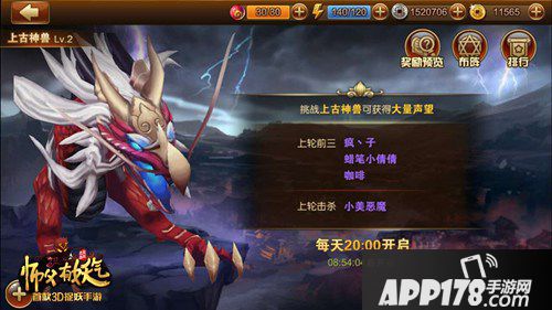 上古神兽为日常限时PVE系统,固定时间内出现,全服所有人均可打,共同累计伤害,神兽消灭或活动时间结束后,根据伤害量排行榜 发放奖励。最后一击玩家可有额外奖励。每天21:15可进入此活动界面挑战神兽,挑战神兽可获得大量声望奖励。战斗开始后,可以进行鼓舞,鼓舞可以选择银币或者是金币鼓舞。银币鼓舞是有机会失败的,1次会有5%的攻击力加成,每鼓舞一次无论成功失败与否都会有40秒的冷却时间。