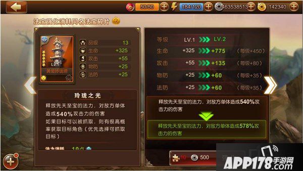 《师父有妖气》中,主角可以装备仙,佛,妖三类法宝,游戏中的法宝品质分为白色,绿色,蓝色,紫色,不同品质法宝增加的属性值不同,白色最少,绿色其次,以此类推,紫色最多,主角和武将穿戴的法宝都是可以通过强化来提升属性的加成,法宝除了有自身的属性加成以外,还可以为穿戴的角色提供手动技能的效果,主角可以更换穿戴的法宝,从而在战斗中发挥不同的作用。