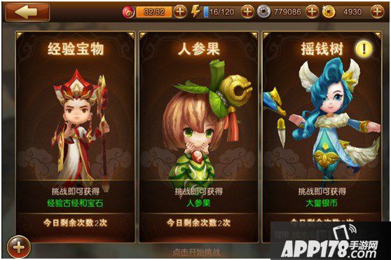 2. 试炼之地界面中包含了三类副本,包括经验宝物,人参果,以及摇钱树