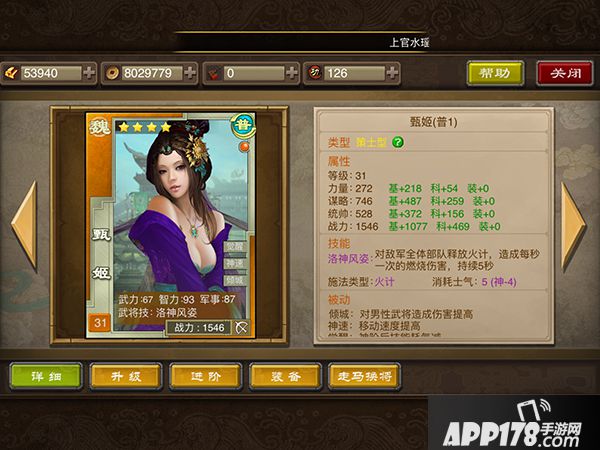 在新手任务里游戏会送你第一个橙色武将甄妃,和王允一样甄妃也是后排法师,不过这是一张橙卡,三围属性不用多说甩王允几条街,攻击技能是对敌方全体持续伤害5秒,我做了个测试在神4以后和王允同样的装备伤害大约是王允2.5-3倍。但是因为是橙色武将升级消耗比较紫将要高不少,所以大部分新人直接无视了甄妃的存在。