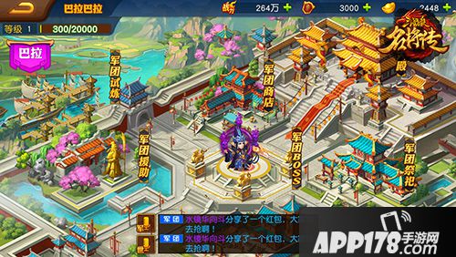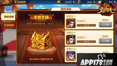 【军团援助】:军团成员之间互相援助武将碎片,完成全部求援还可以领取宝箱奖励。