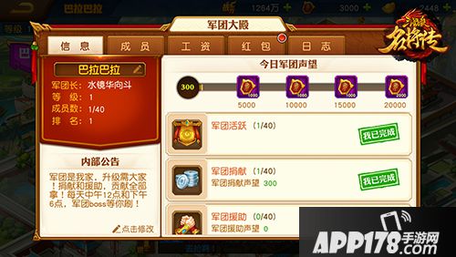 【军团大殿】:可查看军团成员信息、发放和领取军团红包、查看军团成员活跃度和军团日志、退出军团。