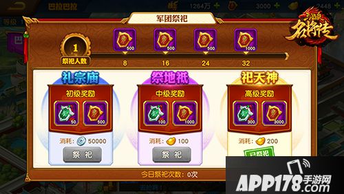 【军团祭祀】:每日祭祀、领取祭祀宝箱奖励。