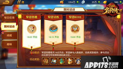 1. 开服第二天开启,通过“任务-限时活动-军团答题”参与,每天18:00固定时间开启答题。