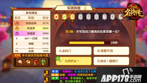 2. 军团成员以答题的方式参与,回答正确获得2积分,回答错误获得1积分。