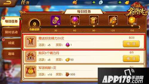 日常任务赠送好友精力20次、游历20次以及60点活跃度的奖励都是精力丹,获得没有难度。