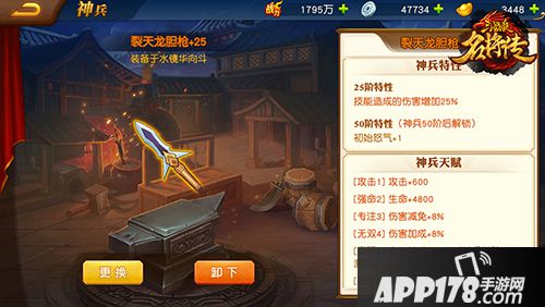 3. 神兵进阶至25阶和50阶,可激活神兵特性,武将获得特殊战斗能力。
