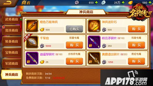 在商店入口有专门的神兵商店,其中可购买到包括主角在内的所有武将神兵的碎片,达成数量即可合成完整神兵。商店每天有一定刷新次数,其中也有机会刷出整件神兵哦。