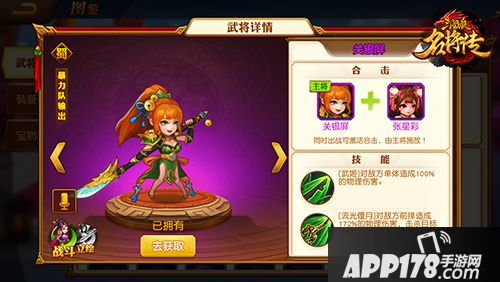 以关银屏和张星彩组合为例,武将图鉴中可以看到关银屏是这个合击武将组合的主将,合击技能将由关银屏来发动。