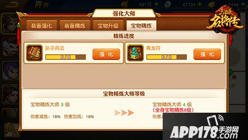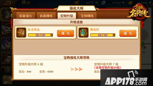 2. 宝物分为两个部件,兵书强化增加攻击,兵符强化增加生命。