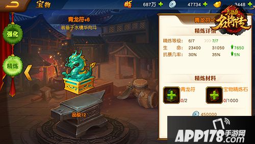 3. 宝物可精炼的等级也有上限,该上限值同样也与主角等级有关,精炼等级上限=主角等级*0.12(向下取整)。比如主公等级54级,宝物最高可精炼到6级。
