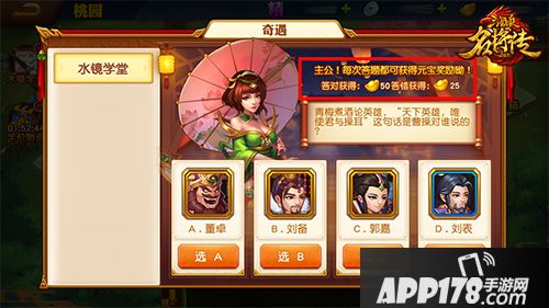 游历玩法中的“水镜学堂”奇遇,完成答题即可轻松获得元宝奖励。
