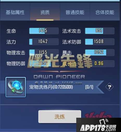 洗练宠物资质:玩家在宠物界面点击“资质”标签栏,点击洗练可以使用宠物洗练丹重置宠物当前的所有资质、成长和初始技能,宠物的资质越高、成长越高,宠物的能力就会越强。