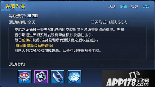 而通过任务和活动达到30级以后,就可以进行裂隙入侵的活动啦~裂隙入侵的活动需要至少3人以上的玩家组队进行活动,组队人数越多,经验获得也越多哦~每天最多完成60次,而前20次获得的奖励是3倍哦!所以前二十次的性价比是最高的,完成裂隙入侵也会有惊喜宝箱赠送。
