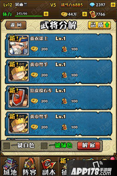 多余武将可在城池-熔炉-武将分解中进行分解,分解武将可获得金币和功勋,蓝色及以上品质武将分解会获得武将魂魄。分解升星、升阶后的武将,有几率获得一部分升星、升阶耗材。