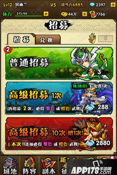 招募系统里有三种招募选项,分别是普通招募,高级招募(1次),高级招募(10次)。