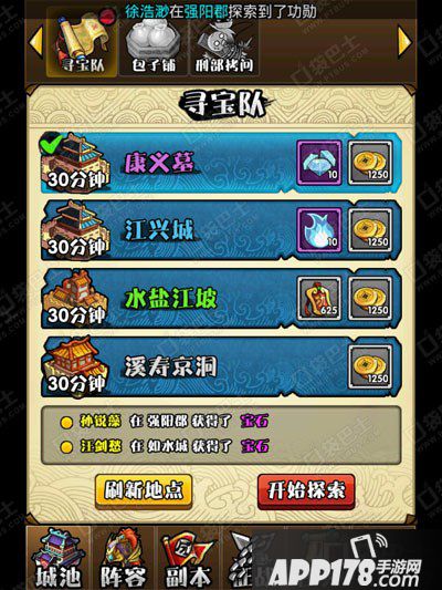 玩友们通过主界面营地就可以看到寻宝队,玩友们可对寻宝地点进行刷新,选择寻宝地点就可以开始探索了如图:
