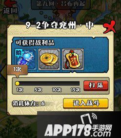剧情副本分为boss关和非boss关,每刷一次副本扣除6点体力。每阵亡一名武将,副本评星扣除一颗星,积累足够数量的星,可在左下角领取评星奖励。
