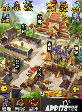 在主城的最右侧有一个招募按钮,点击招募按钮就可以进入招募系统了,我们可以在里面获得各种三国名将。