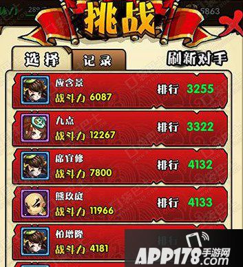 开始挑战就是我们的重头戏了,在这里选择你想要挑战的对手,这个对手是系统自动调取的,当然你也可以刷新对手,一天只有一次刷新的机会哦,当你选择好对手之后就会进入pk界面啦,如果你获胜有奖励可拿,要是你不幸失败的话,那么你的排名不会增加,同时还会有三个半小时的冷却时间,在这段期间内你不能发起挑战。在挑战之后系统会有专门的记录界面来记录我们操作哦,包括成功失败以及排行。