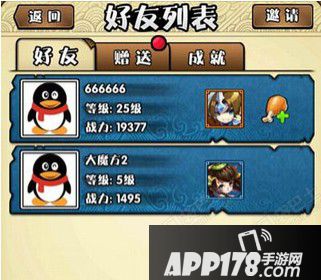 这里可以看到自己所以qq好友中玩三国笑传的朋友,还可以看到他们游戏中的名字、等级和战斗力。
