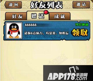 武将图标边上还有一鸡腿按钮,点击鸡腿,就可以赠送该好友游戏体力了,每次赠送体力为6点,赠送完后你还可以选择告不告诉他。