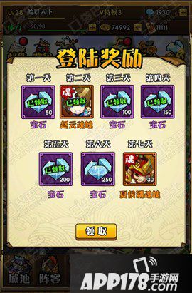 登陆奖励:连续登陆7天即可获得橙色武将夏侯渊,登陆游戏时会自动弹出领取奖励界面