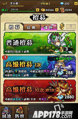 为武将主要获取途径,分为:普通招募、高级招募1次、高级招募10次三种