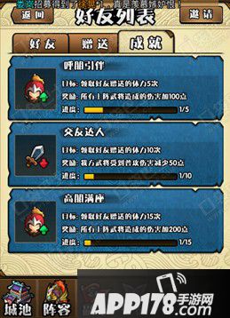 三国笑传好友系统中,玩友们除了可以赠送体力之外,还可在成就中获得奖励,当然还可以结交更多好友,进入游戏好友界面,玩友们在右上角会看到邀请按钮,点击邀请就可以添加好友了。