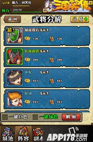 武将系统中还有一个就是分解,我们后期可能会获取很多的武将卡牌,有的卡牌是等级很低的卡牌以及重复的卡牌,会给我们的携带上限造成负担,这个时候我们就可以分解不想要的卡牌,武将卡牌分解之后会获取相应的补偿哦,所以对于大家不想要的卡牌还是快快的分解掉吧。