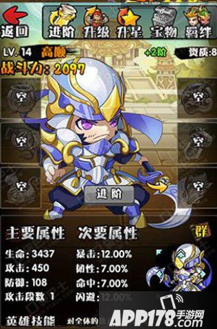 武将系统中,玩家们可以通过入手的时间,品质的高低以及等级的高低依次来排列这些武将,而我们可以通过点击武将来查看武将的具体属性,一般武将具有总战斗力,进阶界面,主要属性,次要属性以及英雄技能,而武将的等级是从橙色卡,紫色卡,蓝色卡,绿色卡以及白色卡依次递减的,所以我们不同类型的阵容就需要不同属性技能的英雄。