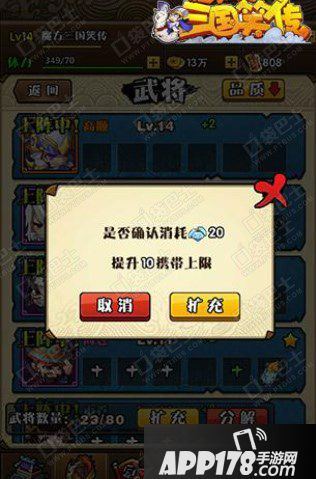 上面我们说到携带上限,携带上限其实就是我们仓库的大小,携带上限大一点你可以多储存一点卡牌,携带上限小一点你就只能放弃一些武将卡牌,而携带上限是可以通过钻石扩大的哦,一般20颗钻石可以提升10个携带上限空间。
