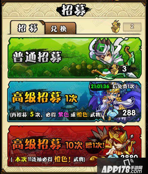 三国笑传十连抽好,还是单抽好?武将抽取是玩友们获得武将的主要途径之一,玩友们可进行普通招募、高级单次招募、高级10次招募,但对于得到好的武将,那么是十连抽好还是单抽好呢,下面小编就为大家做了分析。